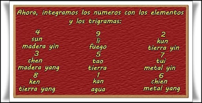 Estos numeros se asocian con los trigramas del I Ching y con los elementos, y son parte fundamental para la aplicacion del Ki de las nueve estrellas y que poco a poco iremos integrando y desarrollando.